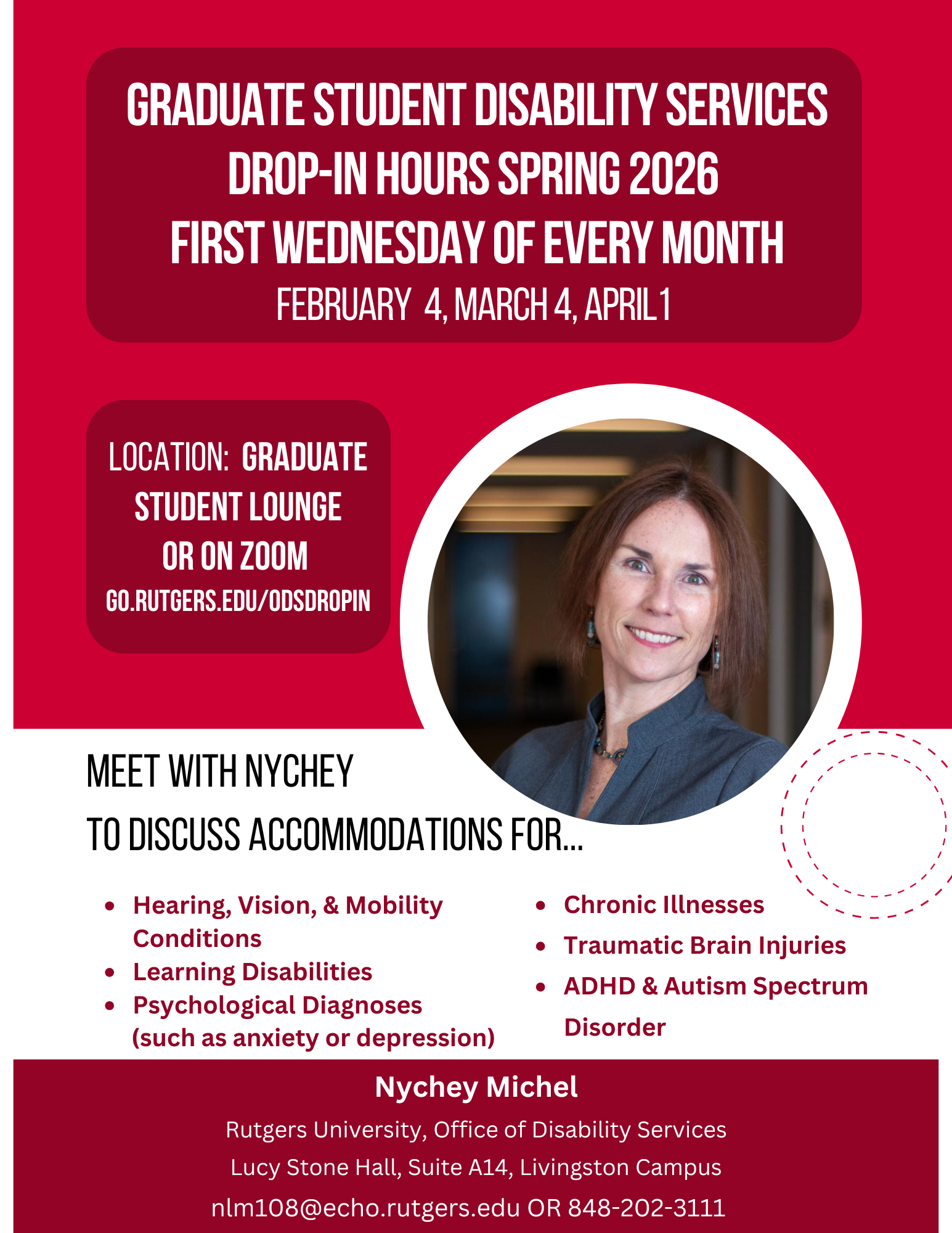 ODS will be held the Wednesday of every month from 2-4 p.m at the Graduate Student Lounge (126 College Avenue), and on Zoom, Coordinator Nychey Michel from the Office of Disabilities Services (ODS) will offer drop-in hours just for graduate students. Come stop by and meet Nychey to discuss accommodations for: hearing, vision, and mobility conditions, learning disabilities, psychological diagnoses (such as anxiety or depression), chronic illnesses, traumatic brain injuries, ADHD, Autism Spectrum Disorder, and More. She can be reached at (848)-202-3111 or nlm108@echo.rutgers.edu. Dates: February 4, March 4 and April 1, 2026. See flyer for more details.
